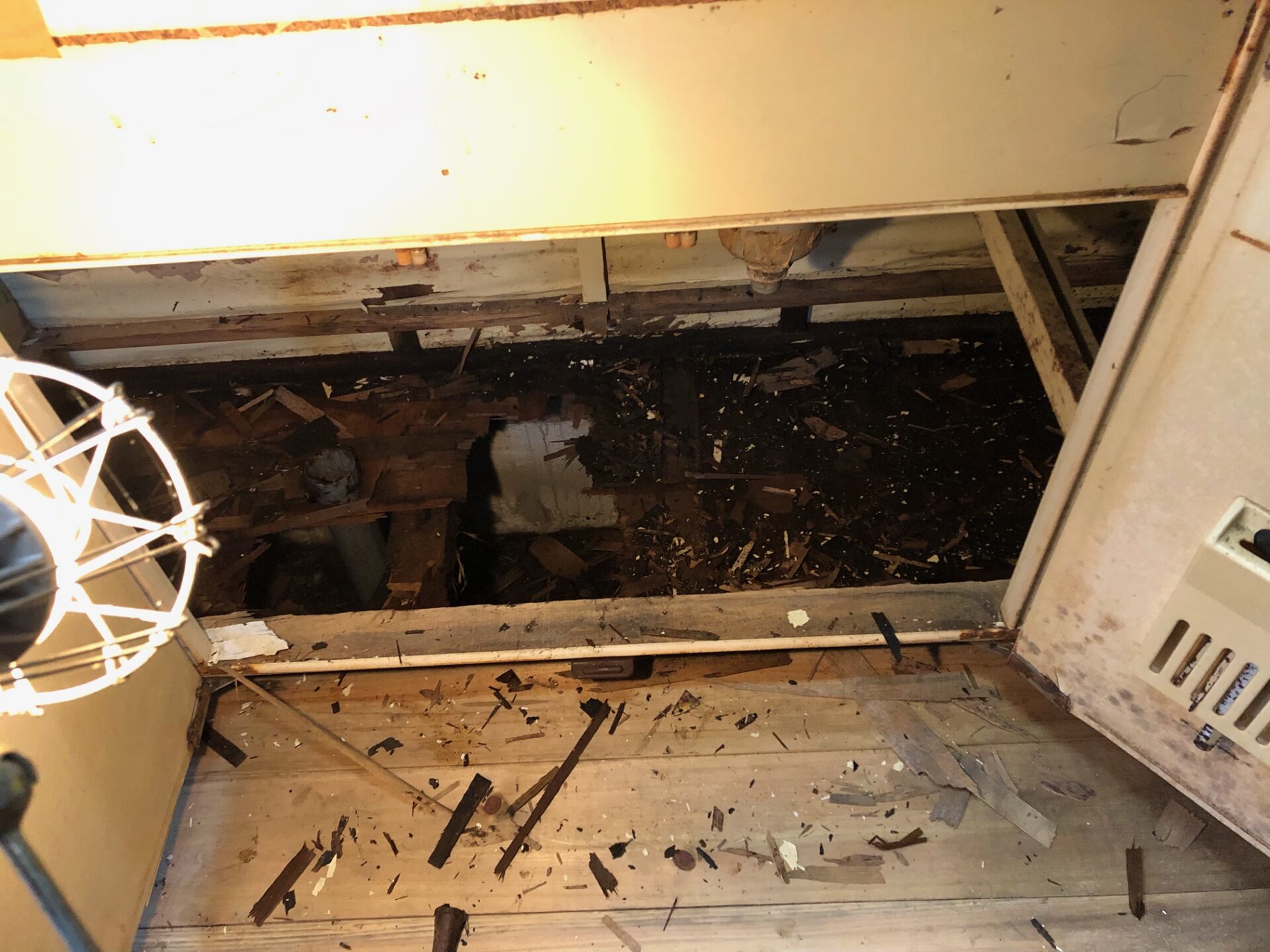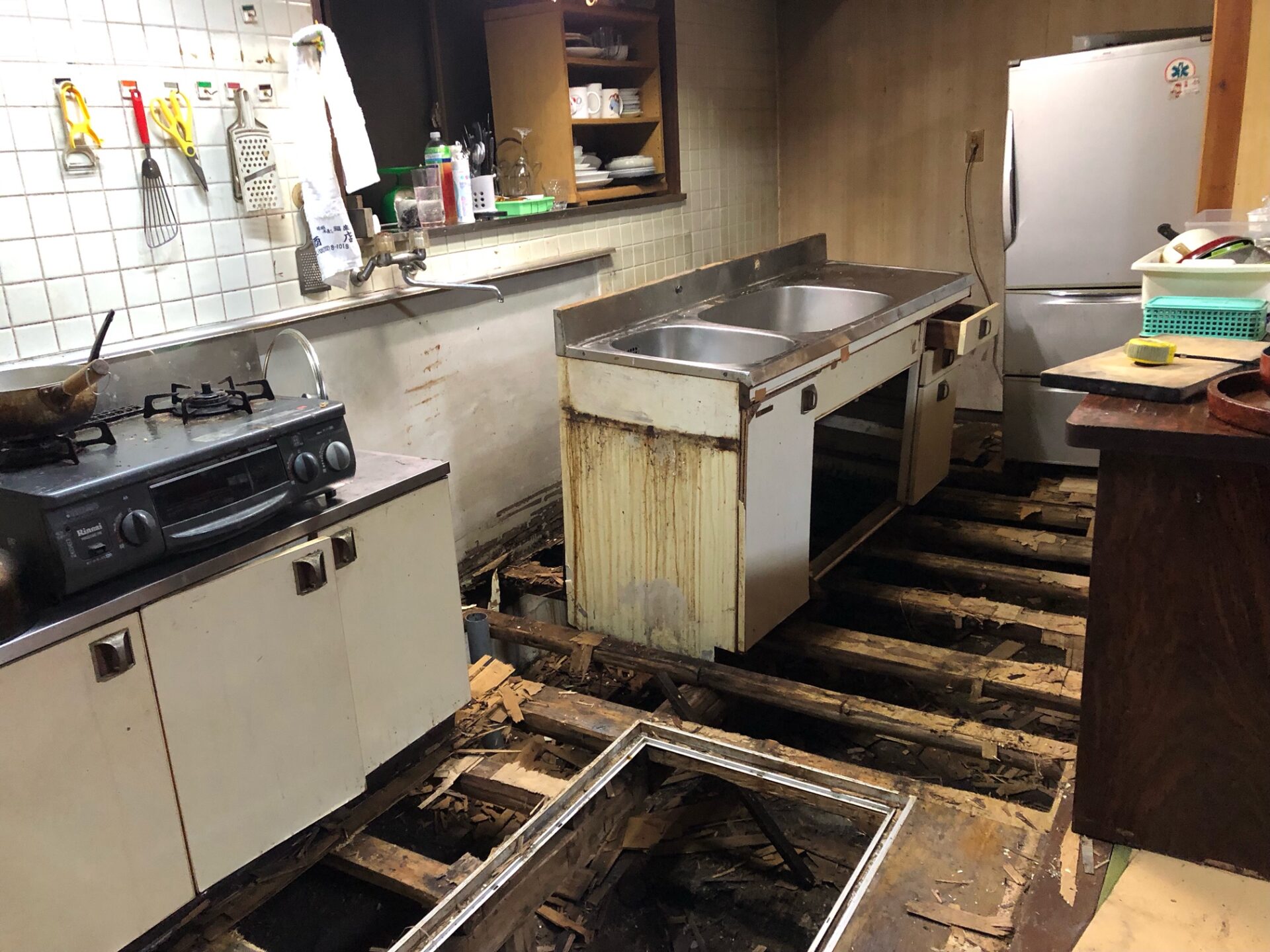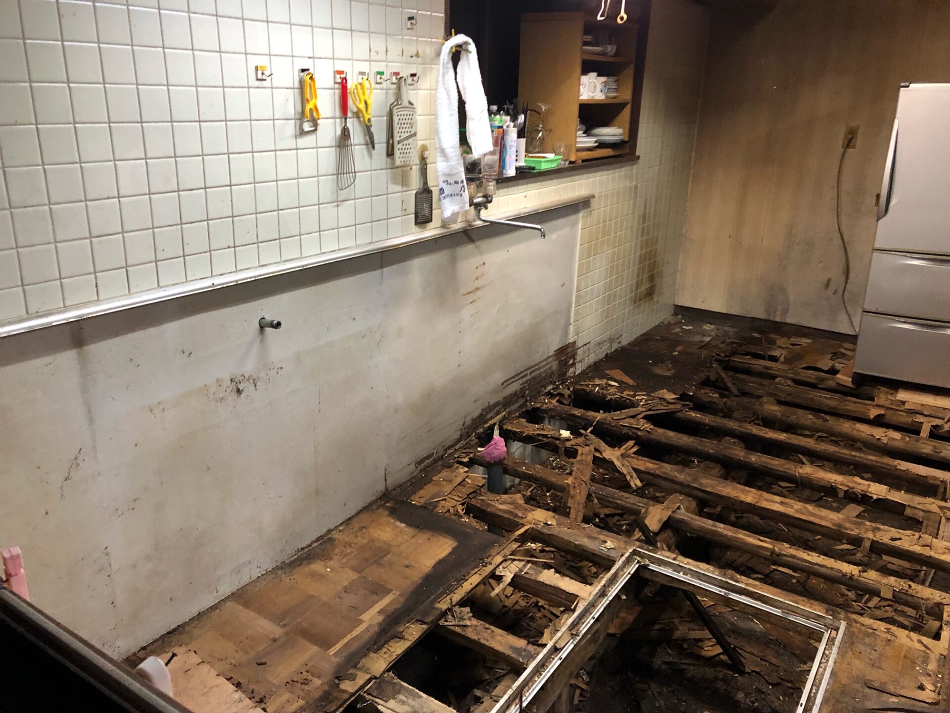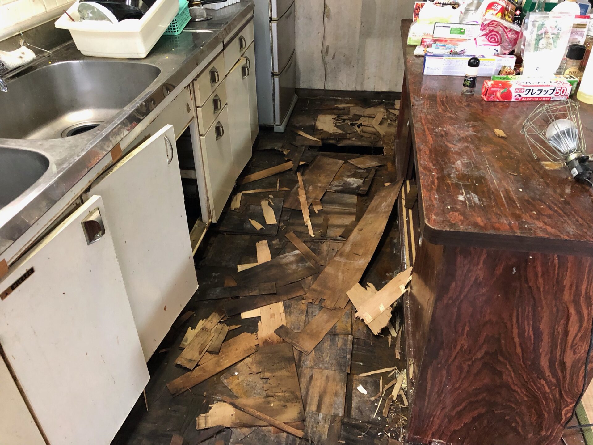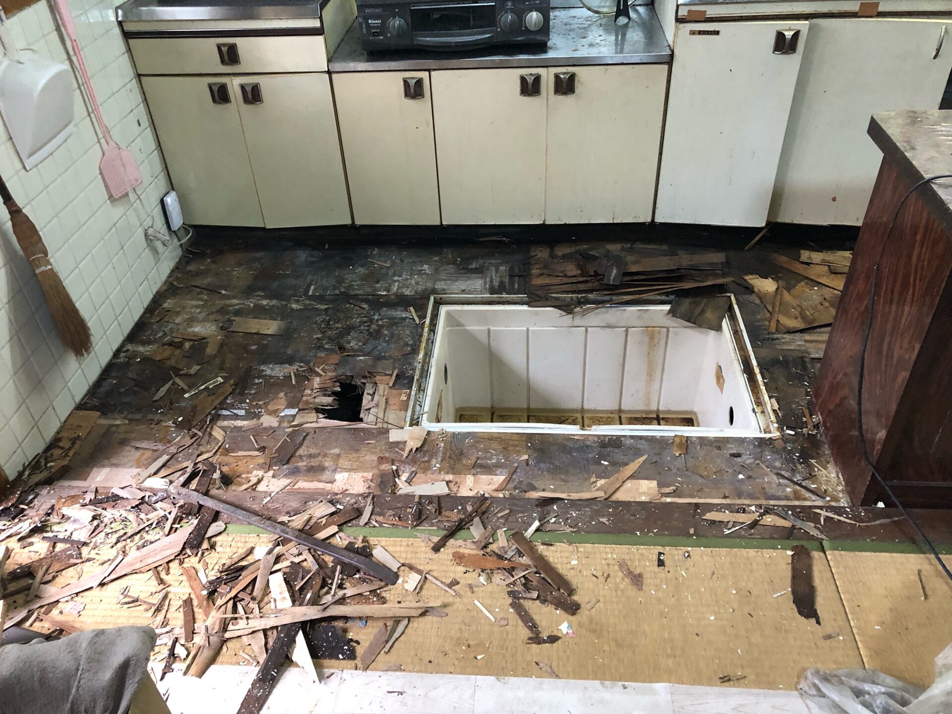 排水管の接続部が外れたためしばらく水浸しで悪臭が激しく床はがしたら大変なことに、、工事はしばらくかかるでしょう。😫
